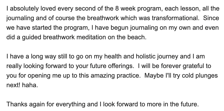 The breathwork may be my favorite—and most transformative—part. I love that there’s an app to help me stay consistent, and even my 12-year-old joins me sometimes. It’s been a beautiful way for us to connect and has helped her navigate middle school stress. Highly recommend!